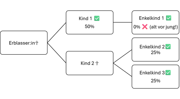 Beispiel: Die Erblasserin hatte zwei Kinder. Ein Kind ist bereits vorverstorben. Die Kinder des vorverstorbenen Kindes (hier: Enkelkind 2 und Enkelkind 3) repräsentieren das vorverstorbene Kind. Sie hätten nach der gesetzlichen Erbfolge je 25% des Nachlasses erhalten. Somit sind sie auch konkret pflichtteilsberechtigt. Das andere Kind (Kind 1) lebt noch. Dessen Sohn (Enkelkind 1) hätte nach der gesetzlichen Erbfolge nichts erhalten („Alt vor jung“). Somit ist Enkelkind 1 auch nicht pflichtteilsberechtigt.