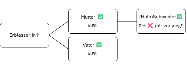 Variante: Ist die Schwester des Erblassers neben der Mutter auch schon verstorben, kann sie durch ihre eigenen Kinder (also Nichten/Neffen des/der Erblasser:in) repräsentiert werden. - Gibt es keine Personen in der zweiten Parentel, kommt die dritte Parentel zum Zug.