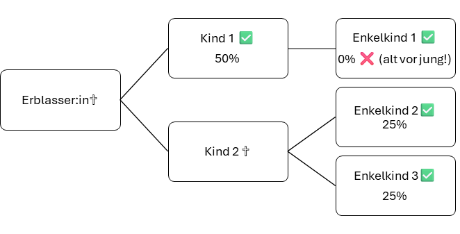 Beispiel: Der Erblasser hatte zwei Kinder, A. und B. A. lebt noch, B. ist bereits vorverstorben und hatte zwei Kinder (Enkelkinder des Erblassers). A. erbt 50 %, die beiden Kinder von B. teilen sich gemeinsam die restlichen 50 % (jeweils 25 %).