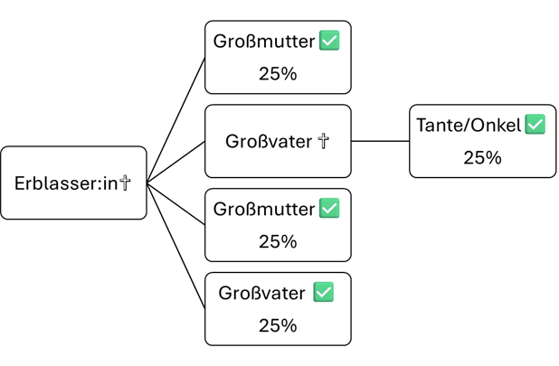Beispiel: A stirbt. Es leben nur noch die Großeltern mütterlicherseits sowie die Großmutter väterlicherseits. Diese erben jeweils ¼ der Verlassenschaft. Der Großvater väterlicherseits kann durch seine Tochter (Tante des/der Verstorbenen) repräsentiert werden. - Wenn das Großelternteil, das vor dem Verstorbenen gestorben ist, keine eigenen Kinder hatte, erhält das andere Großelternteil (entweder mütterlicher- oder väterlicherseits) dessen Anteil. Sollte von einem Großelternpaar kein Großelternteil mehr leben, fällt der gesamte Anteil des verstorbenen Großelternteils dem noch lebenden Großelternpaar zu.